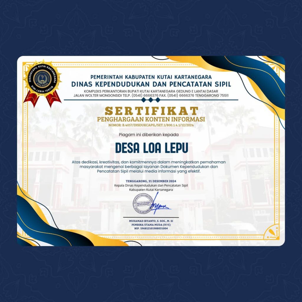 Atas usaha yang luar biasa ini, Dinas Kependudukan dan Pencatatan Sipil Kabupaten Kutai Kartanegara memberikan apresiasi serta sertifikat penghargaan kepada desa-desa tersebut. Semoga prestasi ini menjadi inspirasi bagi seluruh pihak untuk terus berinovasi dan berkolaborasi demi kemajuan pelayanan publik yang lebih baik.