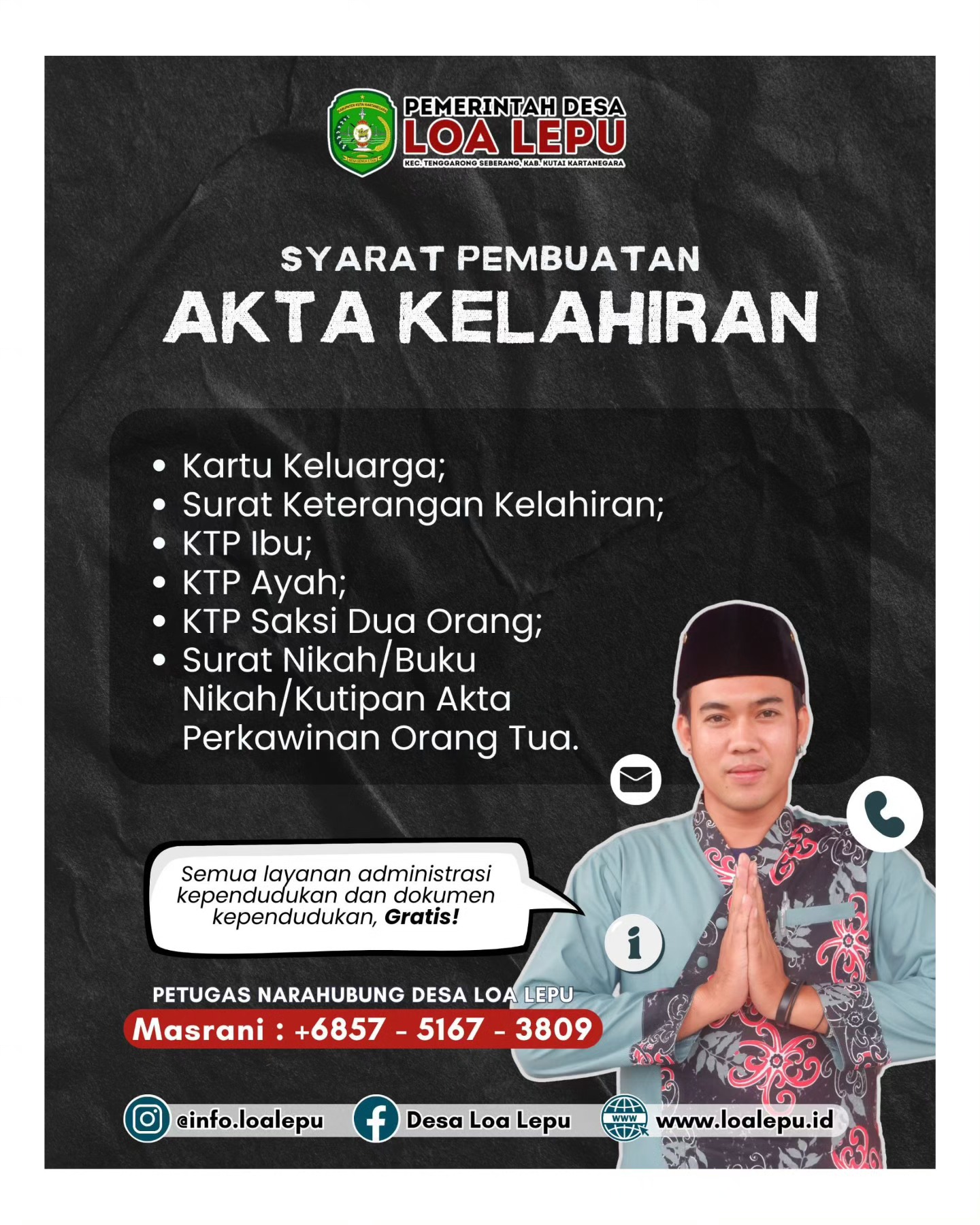 Jika ada pertanyaan, jangan ragu untuk menghubungi narahubung Desa Loa Lepu. Ingat, semua layanan administrasi di desa GRATIS tanpa biaya apa pun!